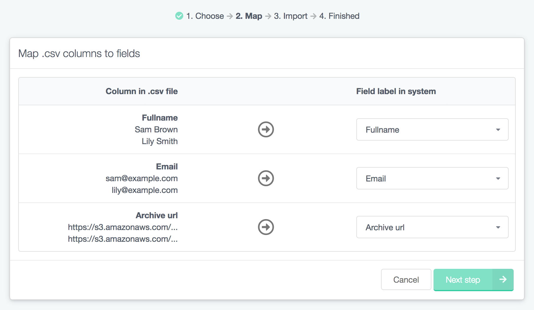On this screen you see the columns from your csv on the left. If you have a header, its name is shown as well as sample data from the first 2 rows.