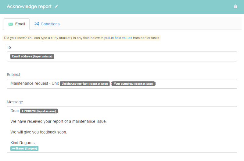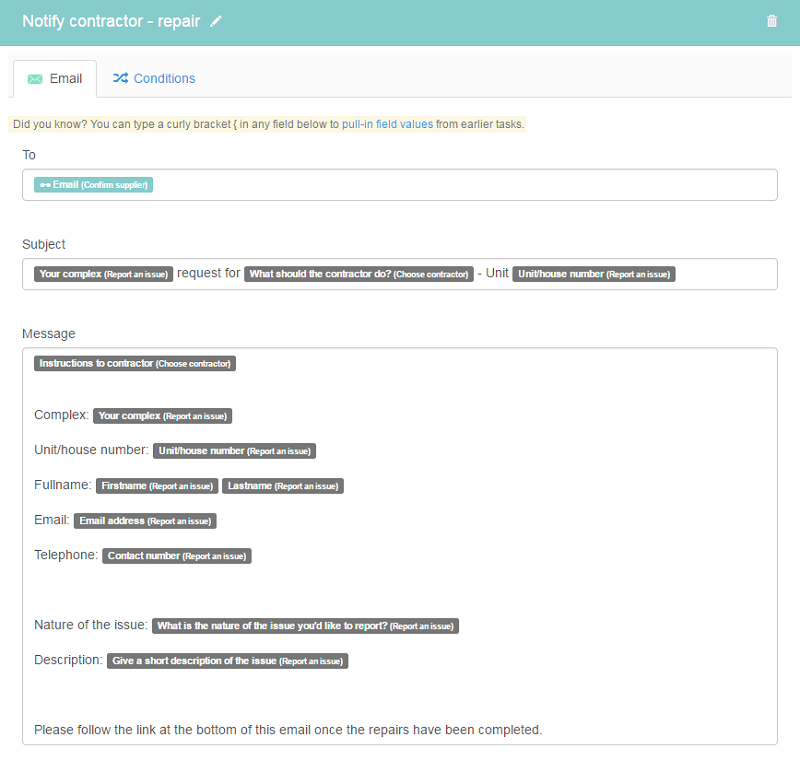 Kotive creates the content of the email by pulling in the owner/tenant's information from the first form in the 'Property maintenance & repairs' workflow - 'Report an issue'.