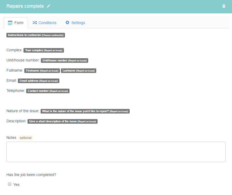 The trustees and the owner/tenant receive an email updating them on the status of the repair work. Details about the status of the job are pulled in from the previous form.