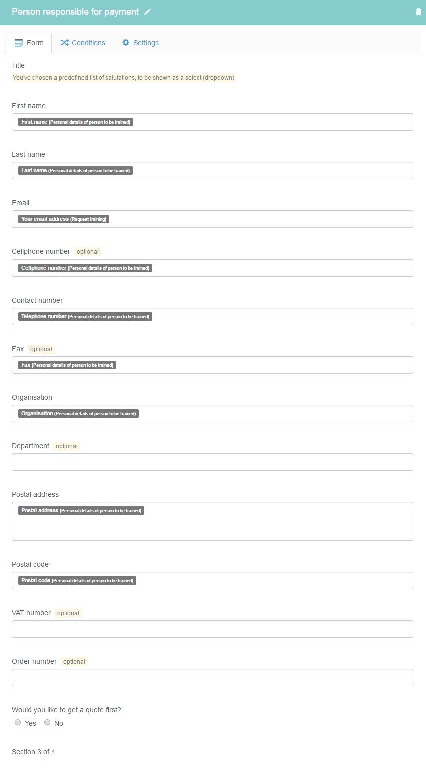 The process of registering for a training event is divided into four forms. This is so that the client only has to deal with a limited amount of questions at a time, making it feel easier to fill in the forms, and resulting in more registrations being completed.