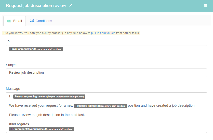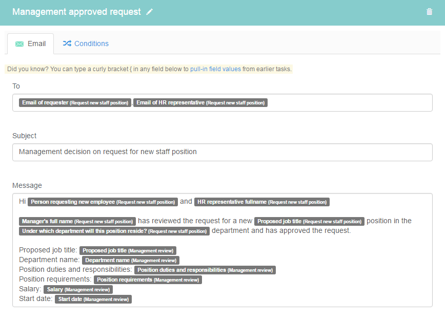 This email will only be sent if the manager approved the request for a new staff position in the previous form task. If the manager approved the request in the 'Management review sub' form task, then a similar email ('Sub Management approved request') will be sent, which pulls in the fields from that form, instead.