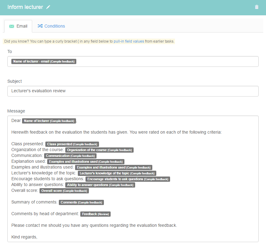 The lecturer receives an email which contains the compiled feedback, along with the feedback given by the department head in the previous form task.